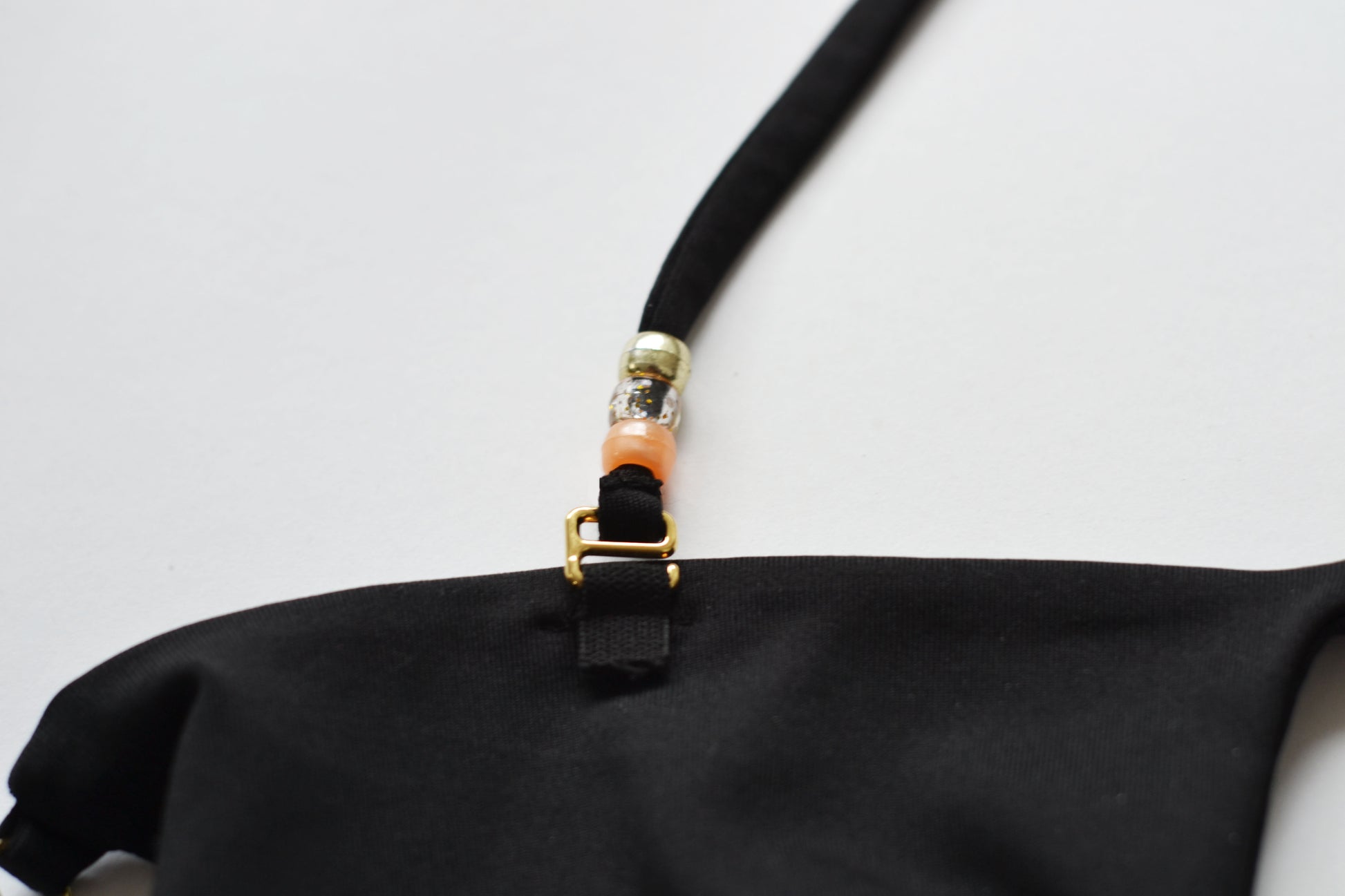 Self lined bikini top with removable halter strap, adjustable back strapping, and beading details.